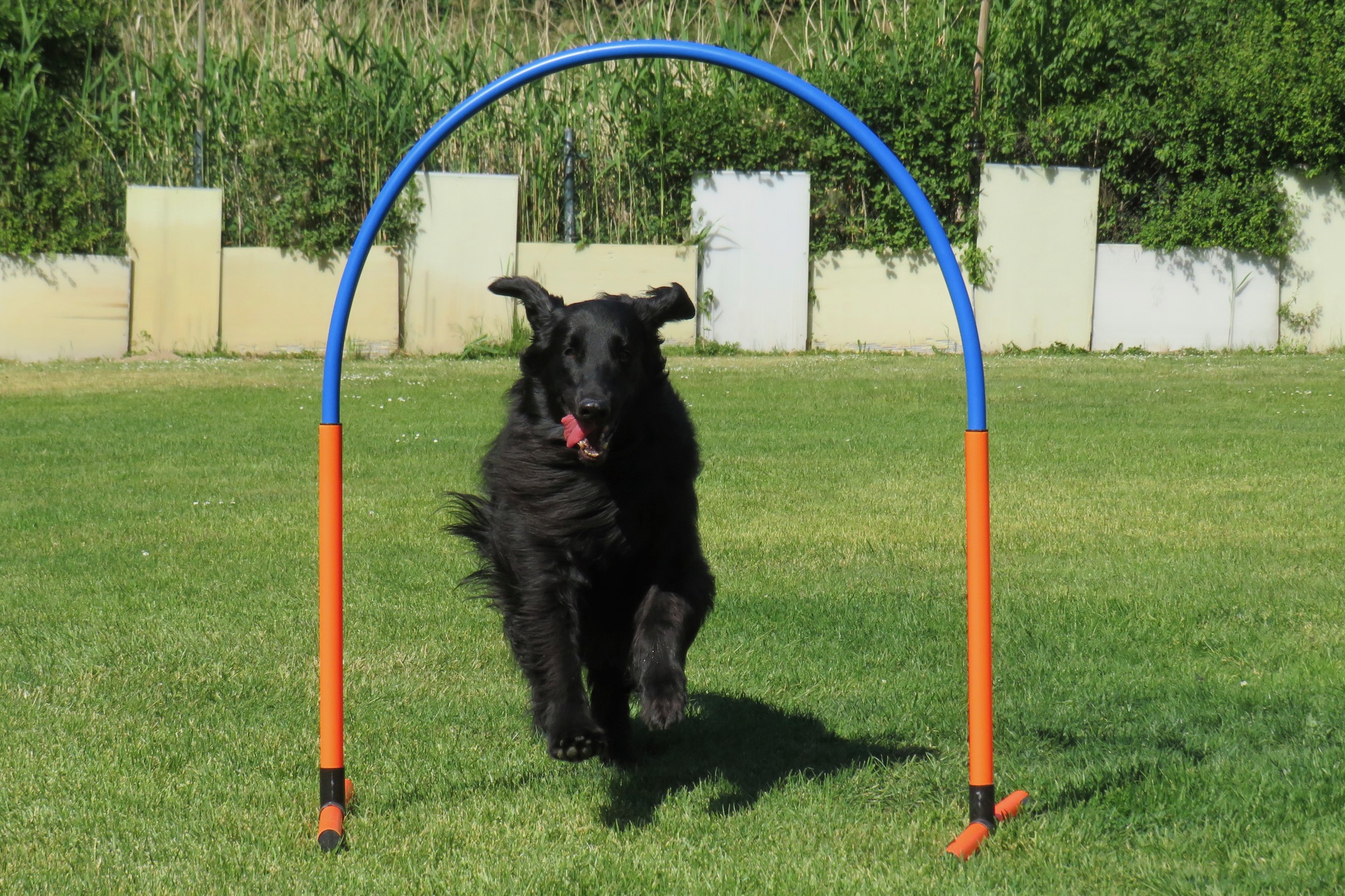 Beim Hoopers müssen die Hunde auf Distanz durch Bögen, um Tonnen oder auch durch Tunnel laufen. Es muss nicht gesprungen werden wie zum Beispiel beim Agility und ist somit für alle Hunde geeignet. Egal welches Alter oder welche Größe.